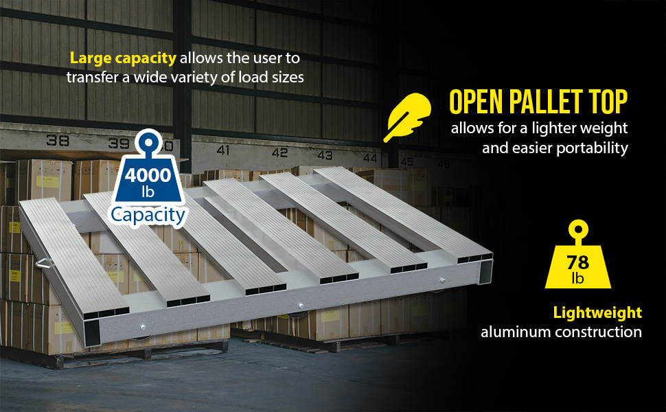 DOL-3648-6T DOL-3648-6TAluminum Pallet Dolly with Tilt 36 In. x 48 In. 4000 Lb. Capacity SilverUniform Static Capacity (lb.): 4,000