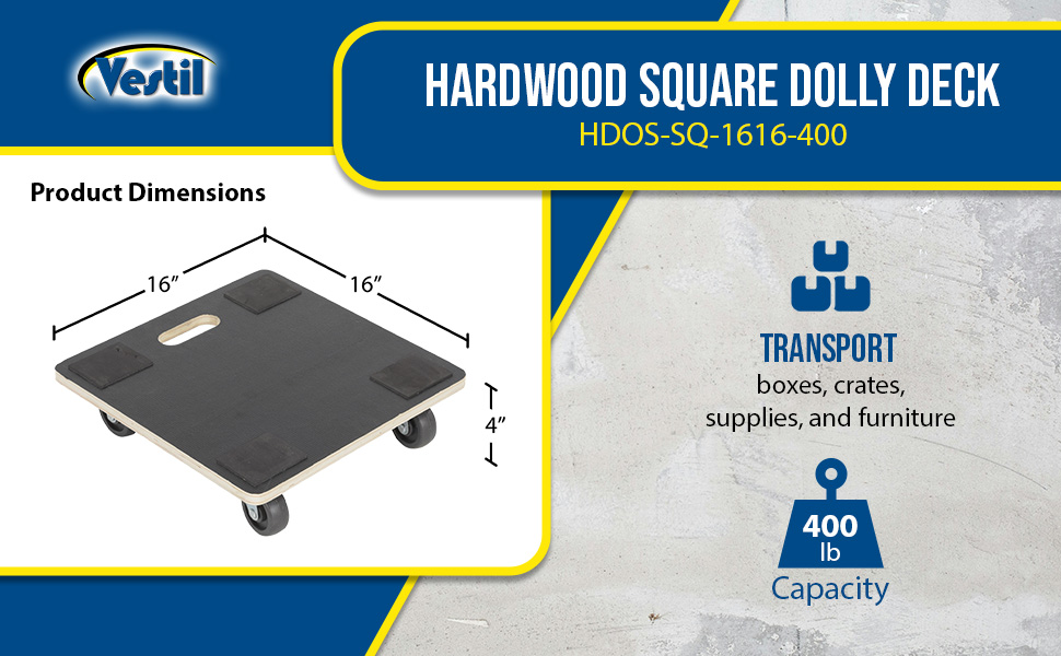 | Hardwood Square Dolly Deck 16 In. x 16 In. x 4 In. 400 Lb. Capacity Black | Uniform Capacity (lb.): 400 Wood Thickness (in.): 5/8 | 7 |