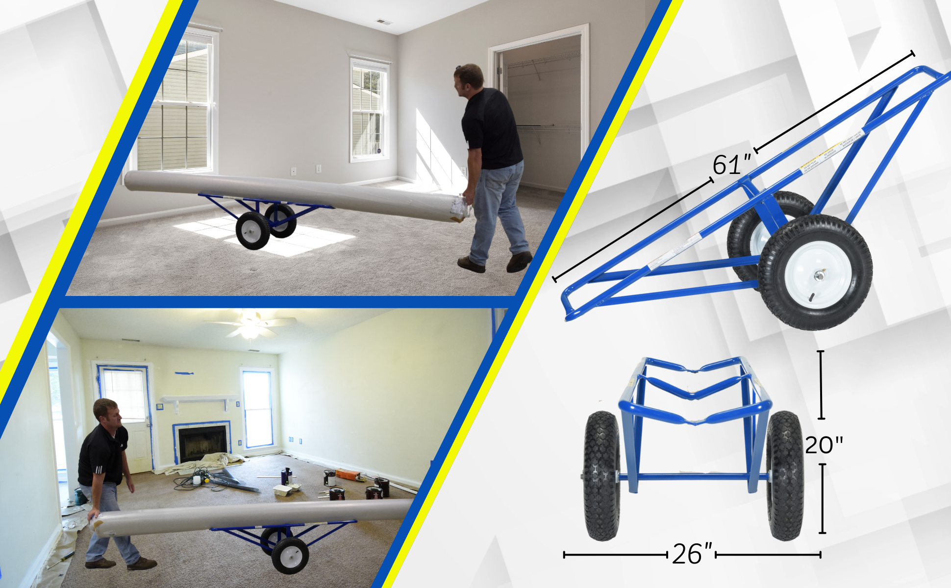 Carpet Dispenser minimize lifting and pulling. Slide carpet onto rollers. Carpet unrolls as needed. Retractable legs stabilize cart.