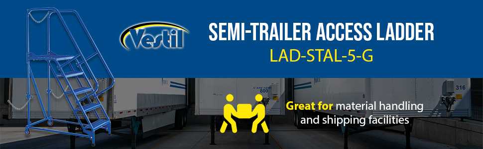 Semi-Trailer Access Ladders are for use getting into Semi-Trailers. Tilt the unit to allow for portability. Units roll on 4" poly-on-poly wheels. Constructed of square tubing framework which handles uniform capacities up to 350 lbs. Features 30" high removable hand railing, access chain, 21" deep top platform, and an industrial baked-in blue powder coat finish for toughness. Each step measures 24" wide by 7" deep and is spaced 10" apart. Climb Angle is 58 degrees. |
