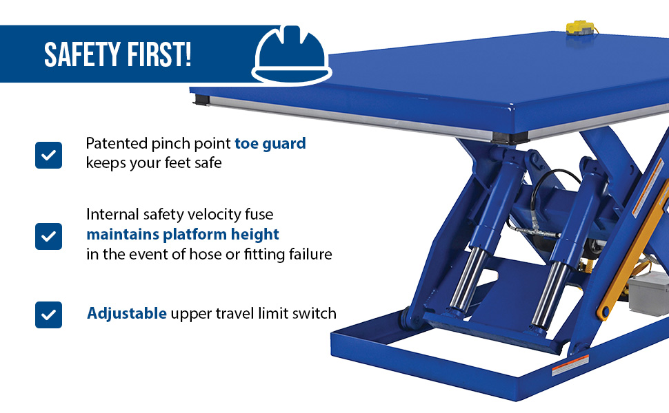 Built for durability and consistent performance, these electric lift tables feature heavy-duty steel construction and high-pressure hydraulic components. Standard safety features include electric toe guards for pinch point protection, internal velocity fuses to prevent sudden descent, upper travel limit switches, and maintenance props for secure servicing. A push-button hand control allows precise positioning, while powerful electric motors deliver smooth and reliable lifting. Multiple voltage options ensure compatibility across facilities.