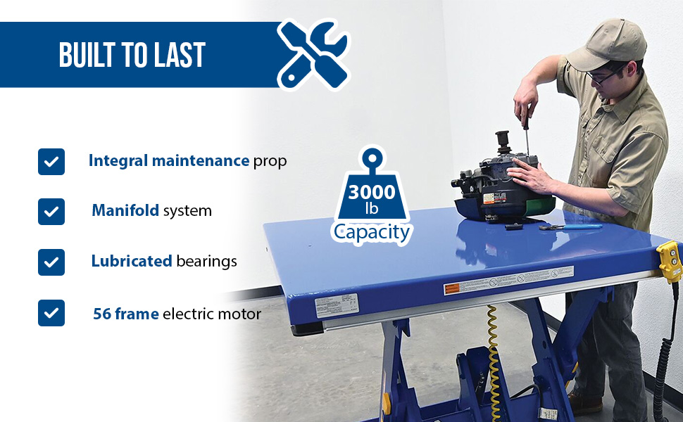 EHLT-4872-3-43-QS EHLT-4872-3-43-QSSteel Quick Ship Electric Hydraulic Lift Table 48 In. x 72 In. 3000 Lb. Capacity BlueUniform Capacity (lb.): 3,000