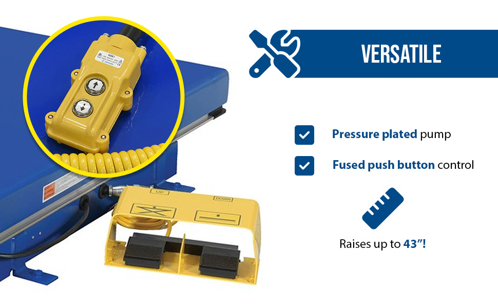 EHLT2448-2-43FC EHLT2448-2-43FCSteel Electric Hydraulic Lift Table with Foot Control 24 In. x 48 In. 1000 Lb. Capacity BlueUniform Capacity (lb.): 2,000