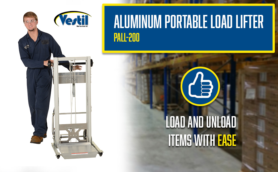 Portable Aluminum Load Lifter is durable, lightweight, and constructed of corrosion resistant aluminum. Ideal in shipping and receiving areas to load and unload pallet racking and to move parts. This unit folds up and down for compact storage and easy transportation. Ultra low profile design with ramp is great for appliance, office, and furniture stores. Features a foot actuated brake. Uniform capacity is 200 lbs.