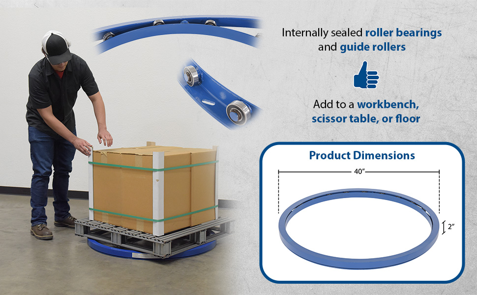 The Manual Carousels rotate materials with the assistance of an operator. Now loading and unloading operations can be done more efficiently; minimizing fatigue and risk of back injury. The carousel may be added to an existing work bench, scissor table, or simply placed on the floor. Constructed of two pieces of rolled structural angle. A series of standard sealed ball bearings transfer the load smoothly and evenly to the supporting surface. Four guide rollers keep the rings aligned.