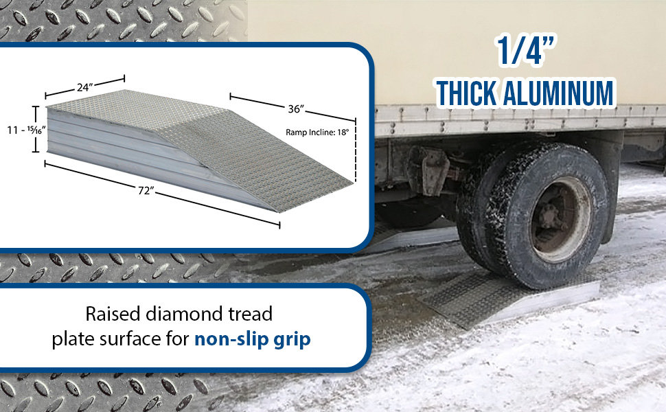 | Aluminum Tread Plate Wheel Riser with Roll Off Guard 72 In. x 18 In. x 10 In. 30000 Lb. Capacity Silver | Uniform Capacity (lbs.): 30000 | 123 |