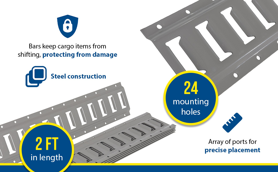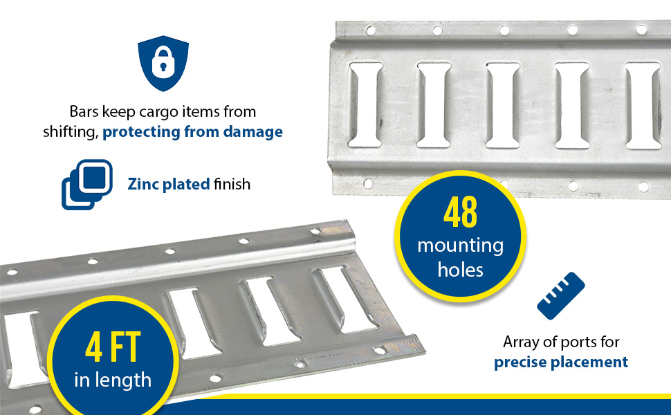 The E-track is a great benefit to shipping and cargo loads. With a steel construction the track allows additional bars to become attached to it. Once, the additional bars are in place the shifting of items becomes minimized. The track design lets the user choose from an array of ports for precise placement. E-TRACK Cargo Bar Assist Tool also available.