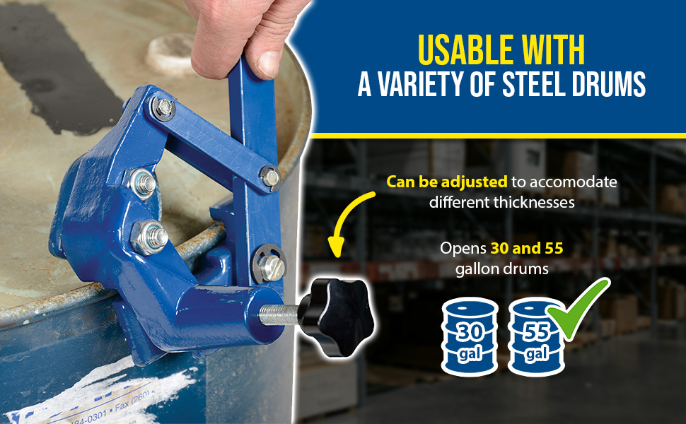The DD-9 and DD-9-NS can be adjusted to open steel drums with different thicknesses. The blade is angled for maximum penetration and flattens the cut edge so there are no sharp or jagged edges. Replacement blades available. Model DD-9-NS features a bronze, spark resistant alloy.