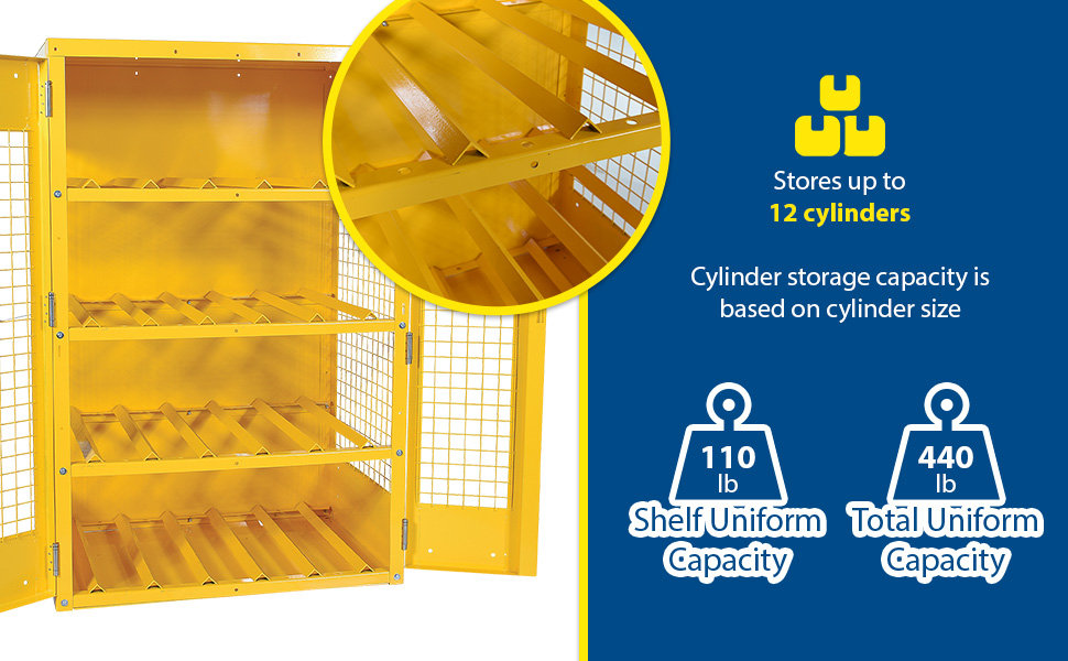 CYL-H-12-KD CYL-H-12-KDSteel Knockdown Horizontal Cylinder Cabinet 32 In. x 45 In. x 68-1/4 In. 12 Cylinder Capacity YellowShelf Uniform Capacity (lb.): 110