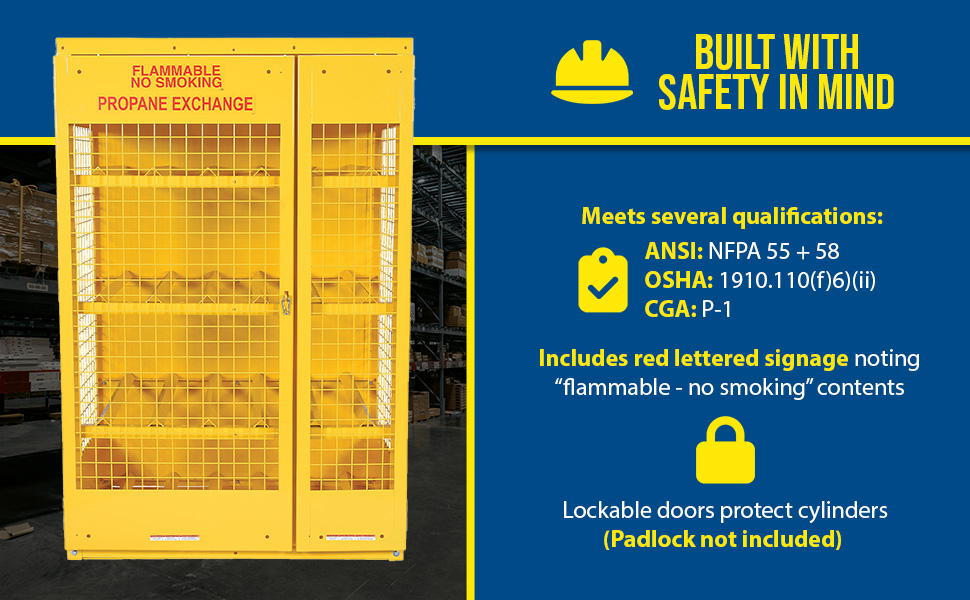 Steel cabinets for storage of cylinders. Cylinder storage capacity is based on cylinder size. Sides are made of expanded steel for an open view design. The top, back, and bottom is made of solid sheet steel. Lockable doors protect cylinders (padlock not included). Base includes lag holes for securing cylinders. Vertical units include chains for securing cylinders. Includes red lettered signage noting "Flammable-No Smoking" contents. Meets OSHA 1910.110 (f)(6)(ii), ANSI NFPA 55 + 58 and CGA P-1 design standards. Rugged steel construction with a baked-in powder coated safety yellow finish for toughness.
