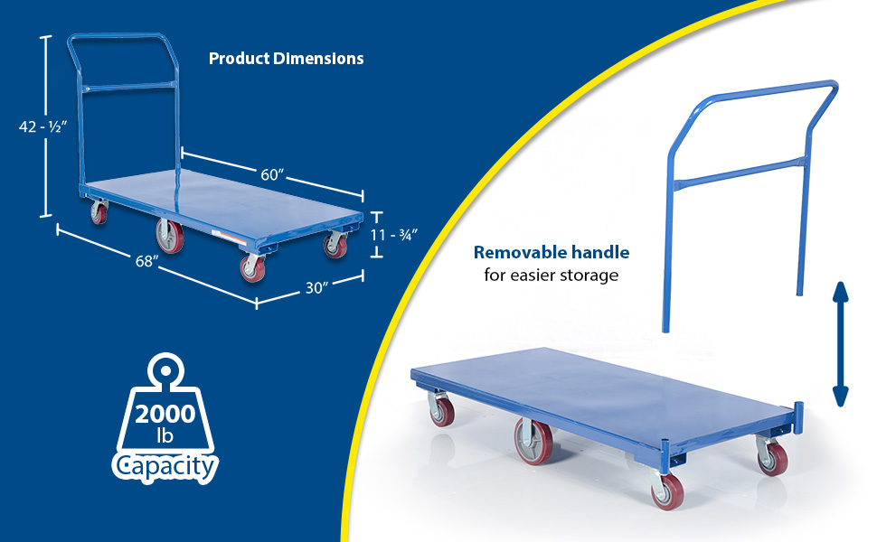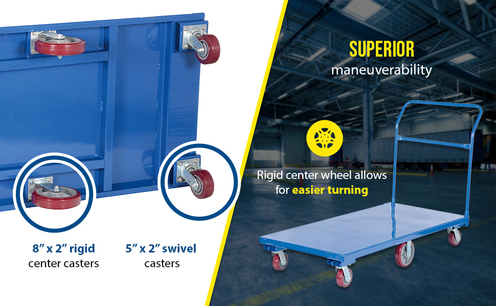 Heavy duty steel platform cart provides long term service. Removable handle. Rolls on (4) 5" swivel and (2) 8" poly rigid casters. Center caster provides great maneuverability. Ideal for industrial, commercial and warehouse use.
