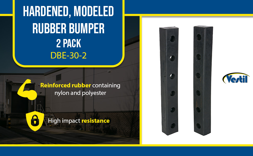 These pre-drilled bumpers are constructed of fiber reinforced rubber containing nylon and polyester for all weather conditions. Provides high impact resistance. Steel reinforcement rings are molded into each bumper for installation. Uses 5/8" anchor bolts. Sold individually. Order installation hardware separately.