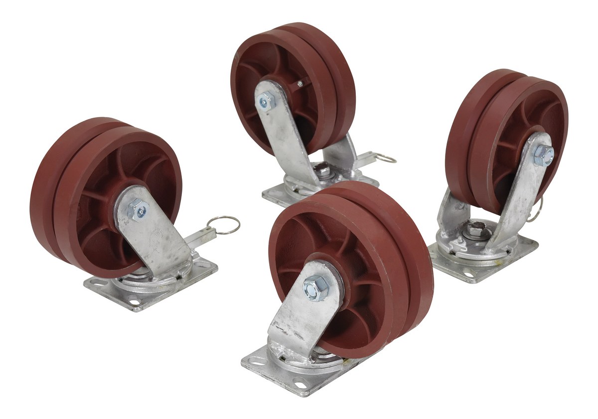 | Set (qty.): 4 | Caster Diameter/Width (in.): 8 x 3 | Plate Size Width/Length (in.): 4-1/2 x 6-1/4 |