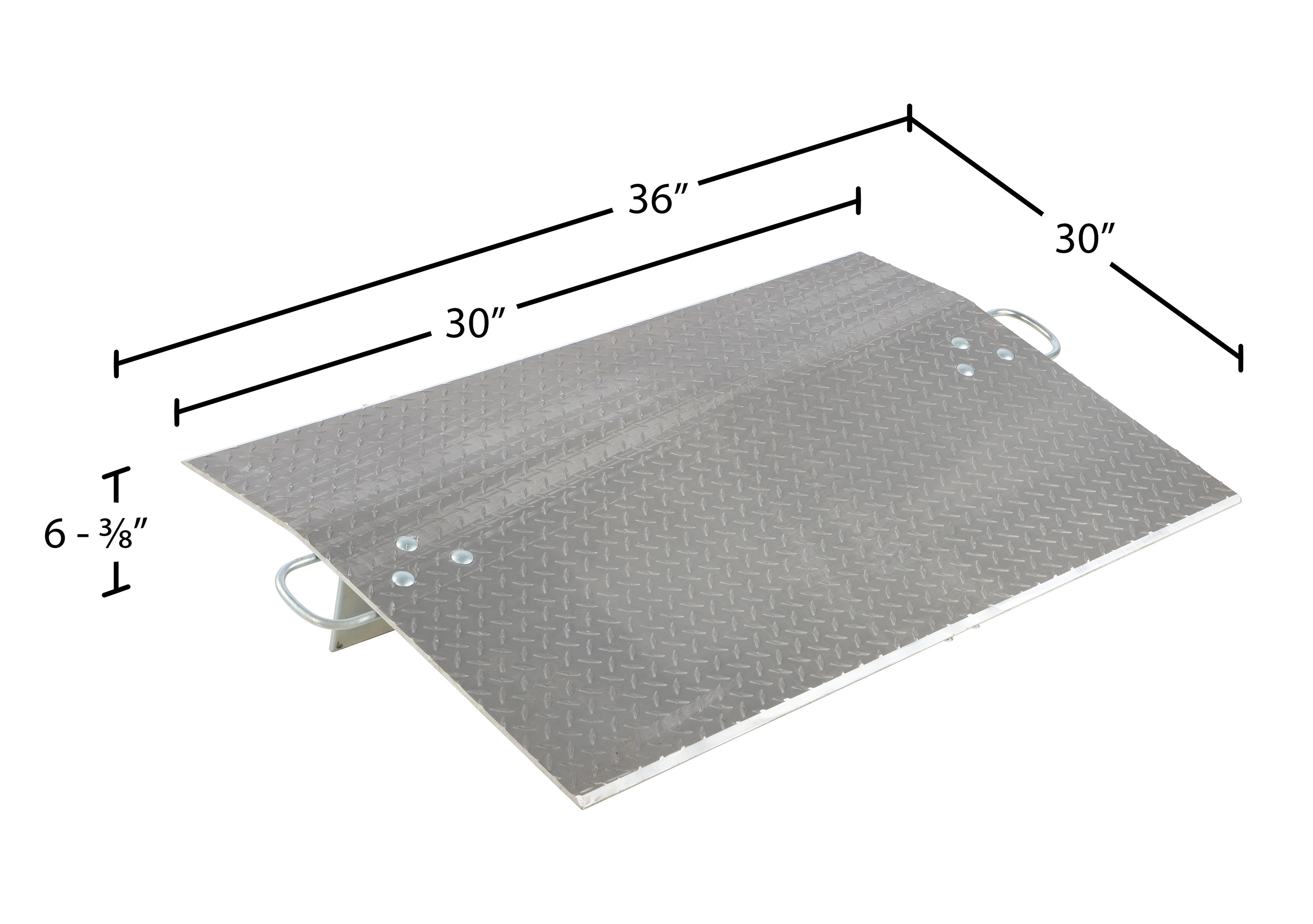 Aluminum Economizer Dock Plate Usable 30 In. x 30 In. 3/8 In. Plate Thickness 2300 Lb. CapacityThe aluminum economizer dock plate is an economical way to speed up truck loading and unloading. The unit spans the opening between dock and trailer to allow pallet or hand trucks along with traffic to safely move in and out of the trailer. The dock plate is constructed of high strength, non-skid aluminum alloy tread plate. The lightweight design with bolt on zinc plated legs and handles on each side makes portability easy. Locking legs for OSHA compliance. Not for use with fork trucks.