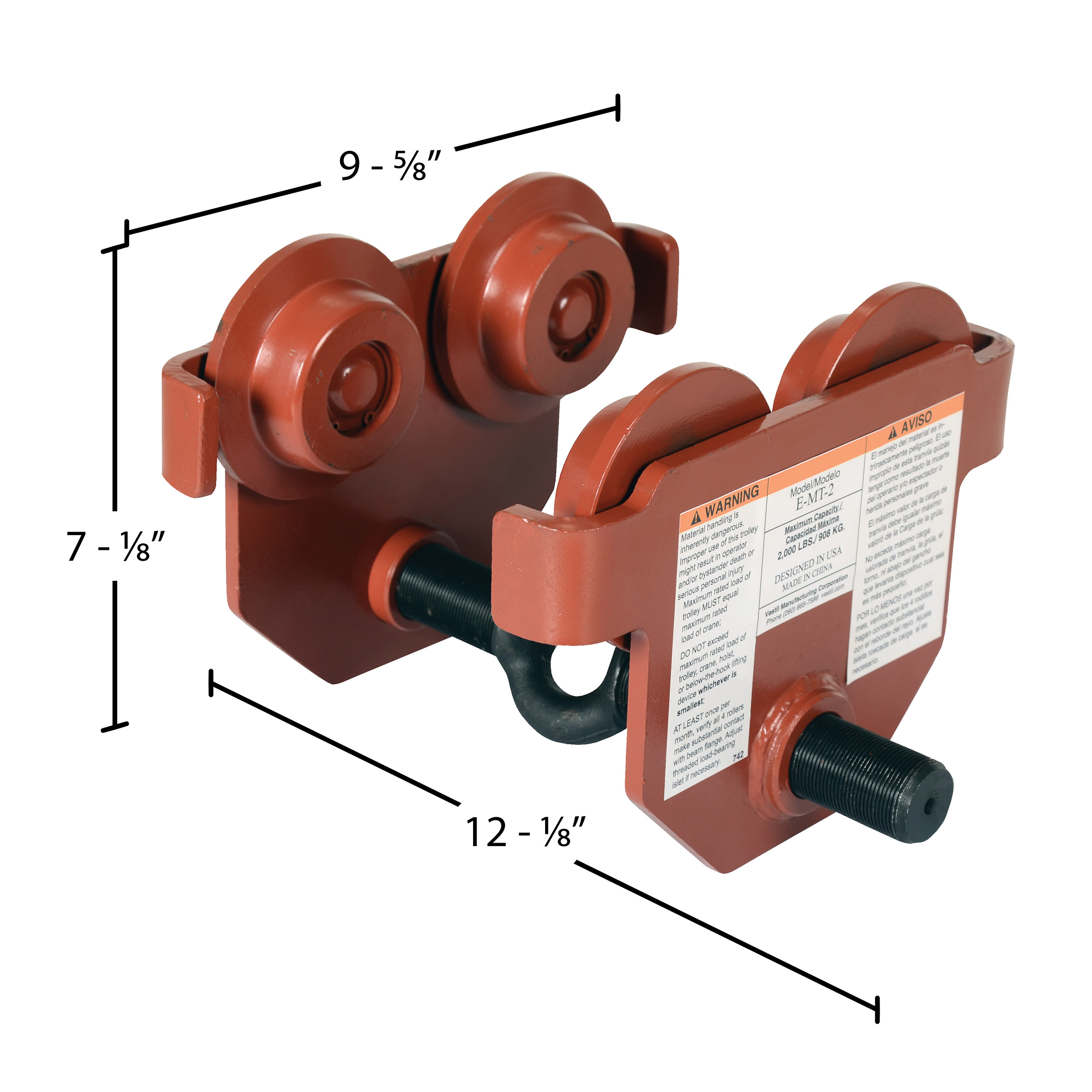 This low profile manual trolley has been designed to quickly install on virtually any S, H, W and M type I-beam. The width of the trolley is adjusted by rotating the center rod with lifting eye clockwise or counterclockwise. Once the hoist (not included) is attached, the center rod cannot be rotated which prevents the trolley width from accidentally changing. This push trolley includes four (4) rollers with sealed bearings for long life. A lifting eye is located at the bottom of the trolley for attaching a hoist (not included). The trolley features steel construction and a painted finish.