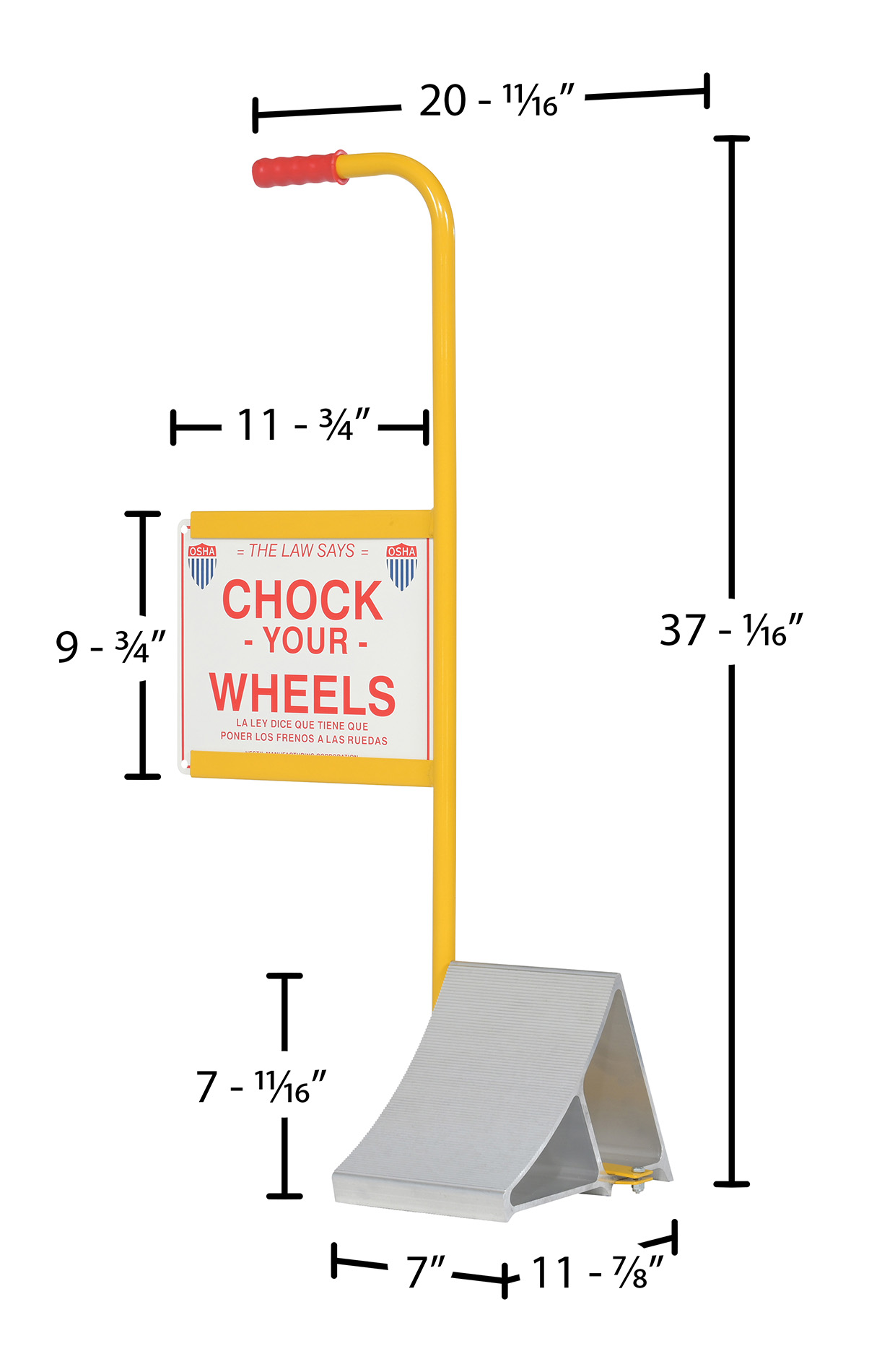 Aluminum Wheel Chock with Handle and Sign 7-11/16 In. x 20-11/16 In. x 37-1/16 In. Silver/YellowThe aluminum wheel chock is ideal for maintenance and industrial facilities. The chock is constructed of extruded lightweight aluminum that is easy to handle. The unit features a serrated top to grip the tire and a triple edged bottom to grip the ground. An extended handle with safety sign is included.