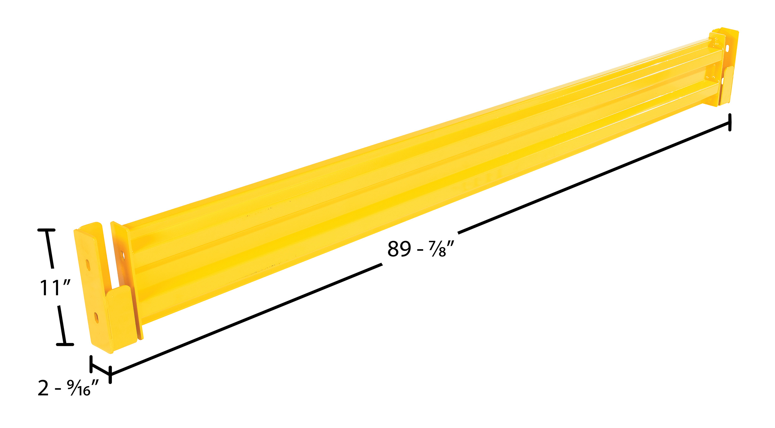 Steel 2 Ribbed Drop In Style Guard Rail 90 In. Length YellowProtecting equipment, inventory, and most importantly individuals from damage or injury is always a concern. But, with a structurally strong steel guard rail those worries can be eased. This rail is double ribbed for impact resistance both indoors and out. With the drop-in style rail design, accessibility is simple and rails can be positioned quickly. To put in place simply slide the rail sections into the post saddles. Powder coated finish for built in added toughness. Additional posts are available and sold separately. If adding a rail to an existing rail and post section, only a single post is needed.
