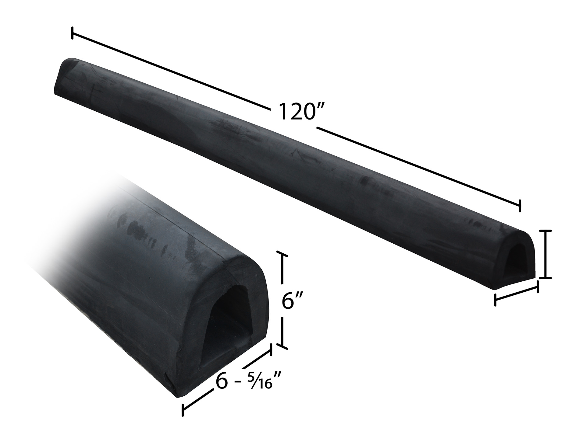 Extruded Rubber Fender Bumper 120 In. x 6 In. x 6 In. BlackThe Extruded bumper protects against heavy impact and damaging results of semi-trailers and trucks. This bumper is made of all weather and abrasion resistant rubber with a half-oval shape that allows for effective fendering action over a wide radius. The unit comes with one washer per hole. The installation hardware is not included, but it is available separately.