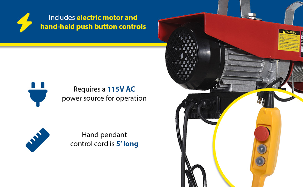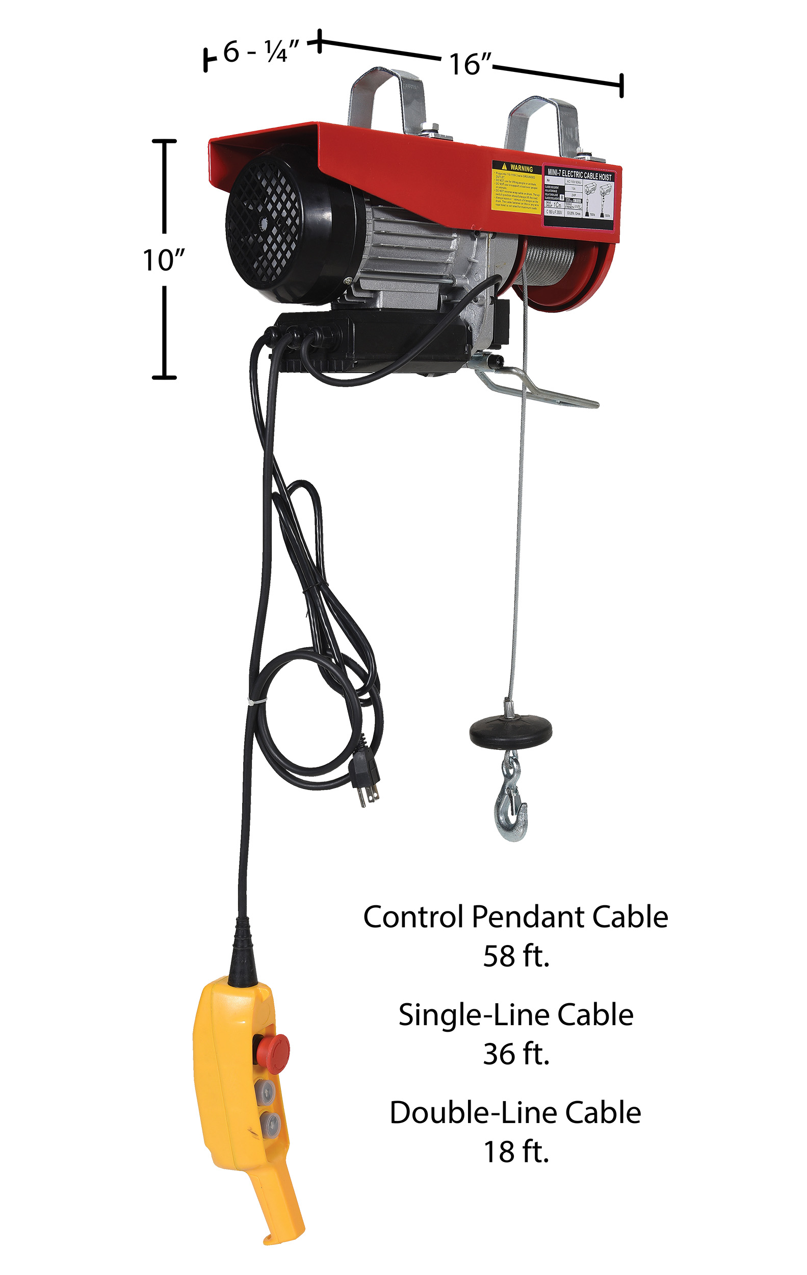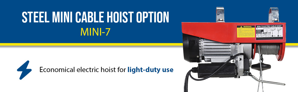 Steel Mini Cable Hoist Option 16 In. x 6-1/4 In. x 10 In. 750 Lb. Capacity RedThis mini cable hoist can be used in both single-line and double-line lifting applications. Includes electric motor and hand-held push button controls. Optional swivel hook plate must be ordered for attaching hoist to trolley, (trolley not included).