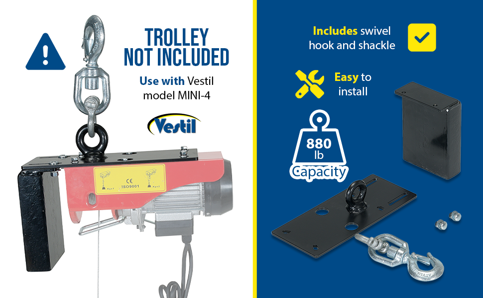 Swivel Hook Plate 15-7/8 In. x 6 In. x 19-1/8 In. 880 Lb. Capacity For Mini Cable Hoist BlackGreat for use with an existing cable hoist. Includes swivel hook and shackle. (Trolley not included.) enables user to lift and maneuver heavy objects with ease.