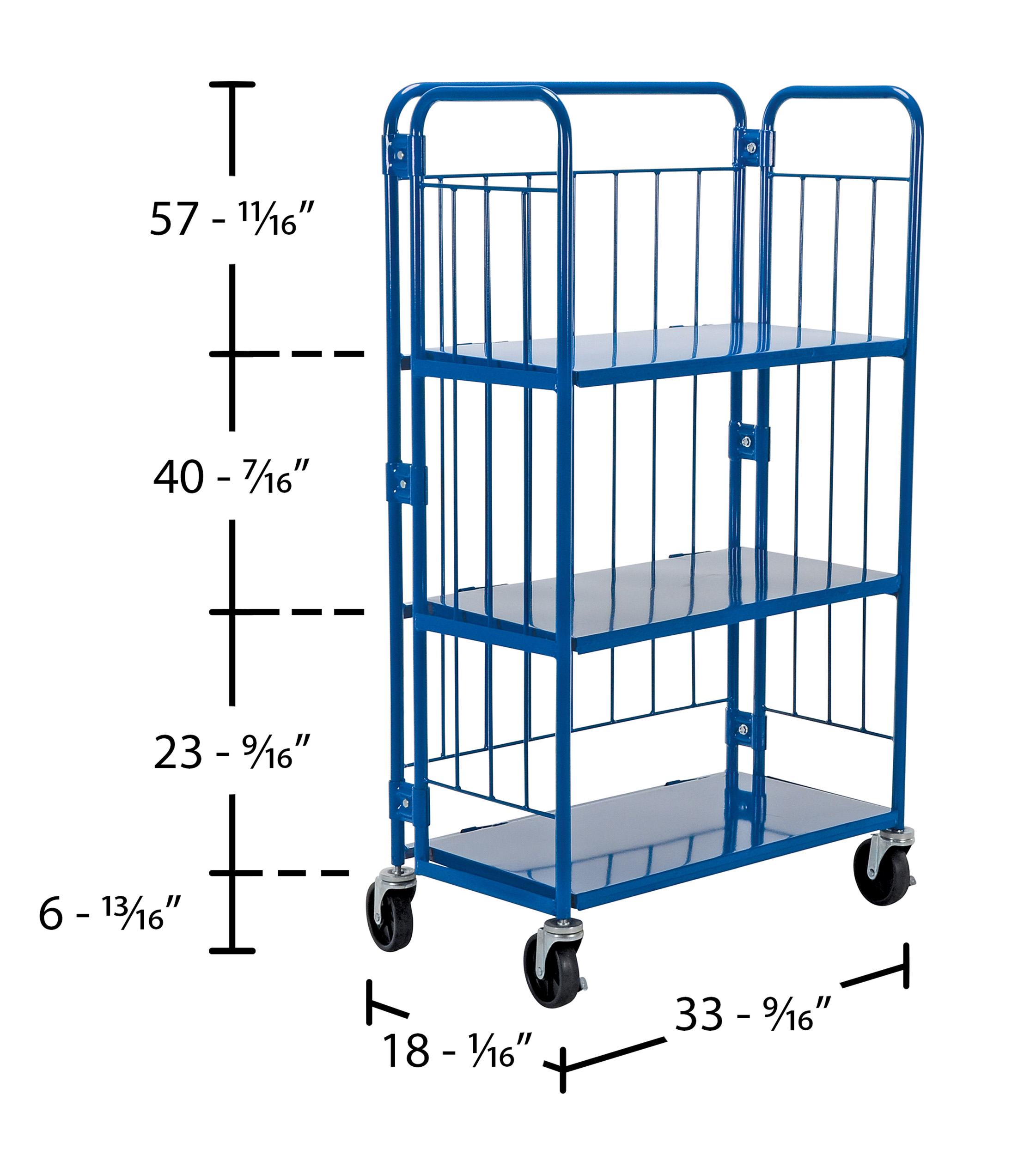 Steel Foldable/Nestable Roller Container 3 Shelf 18 In. x 34 In. x 59 In. 990 Lb. Capacity BlueThe Foldable/Nestable roller container provides convenient portability between work cells or for delivery or distribution of goods. Unit rolls smoothly on casters. To figure individual uniform shelf capacity divide the number of shelves by total capacity.