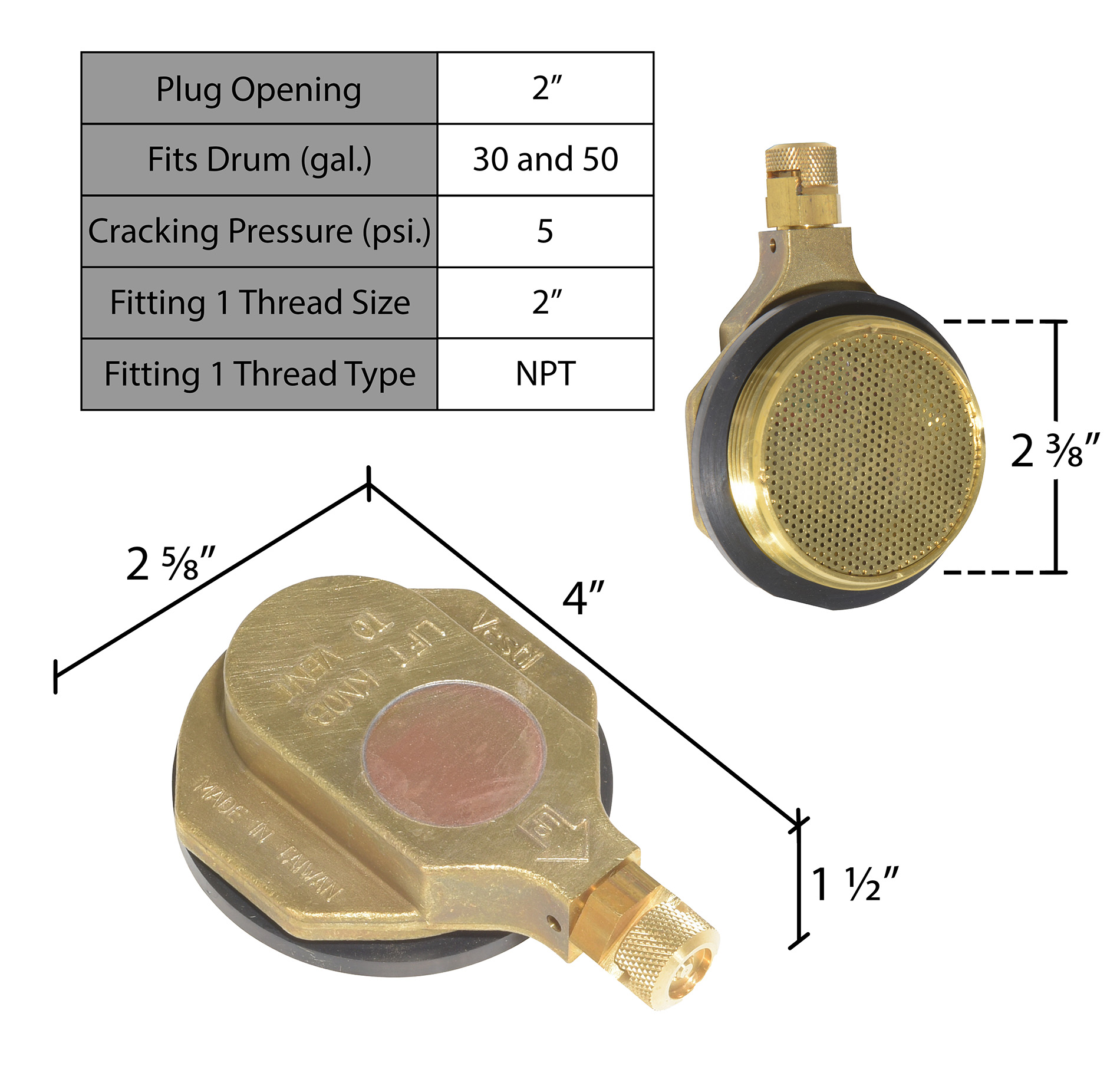 Plug Opening (in.): 2 Fits Drum (gal.): 30 and 55 Cracking Pressure (psi): 5