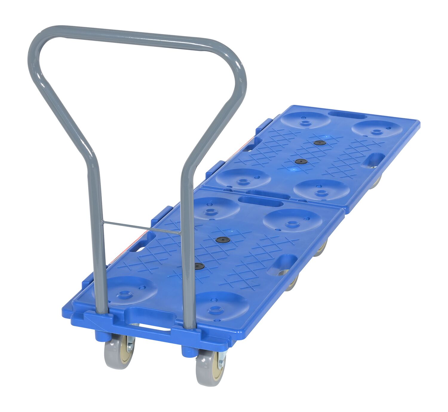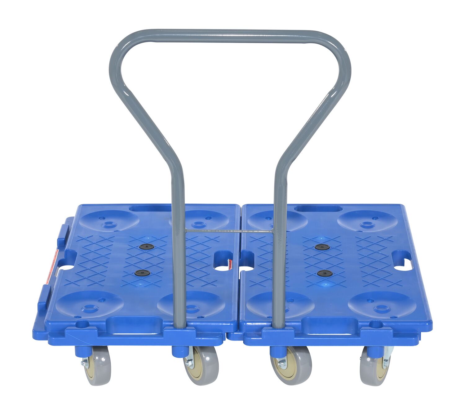 Strong, lightweight dollies include special interlocking edges that allow users to connect multiple dollies together to form a larger platform size. Hand holes are included for convenient carrying, while special pockets in the deck allow for easier stacking. Units roll on (4) swivel 4" x 1-1/4" polypropylene casters. Handle height when installed is 26".