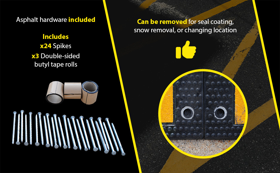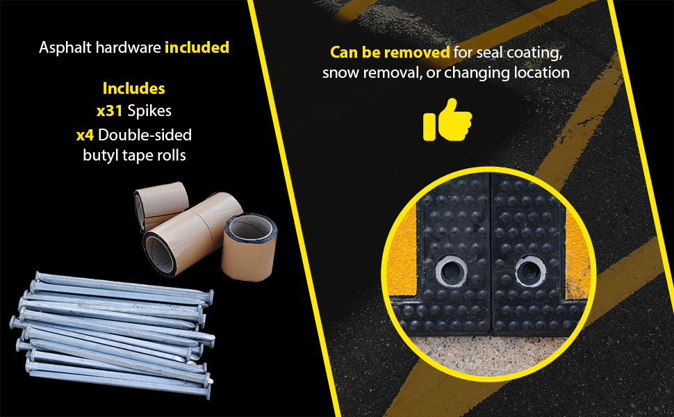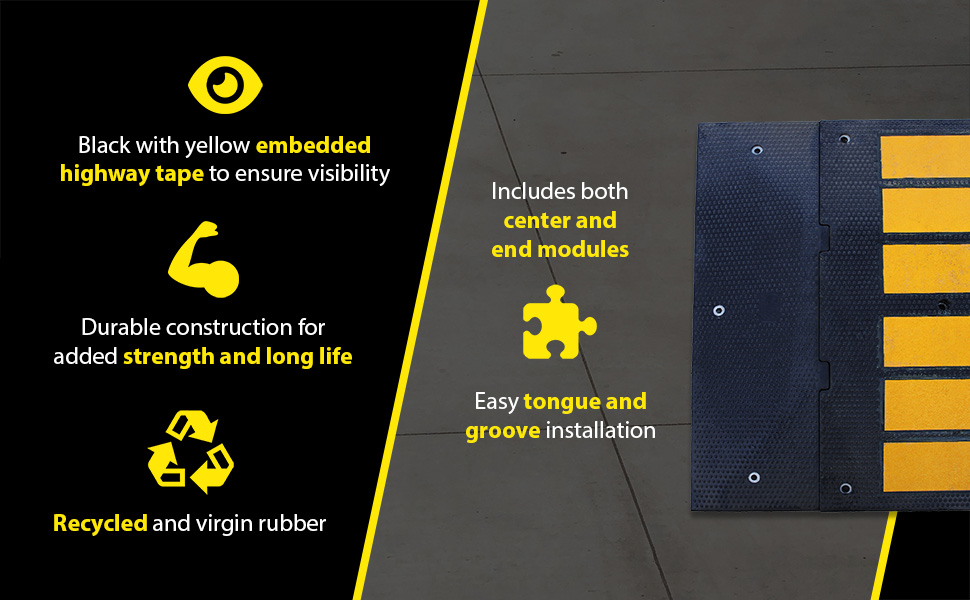 Control traffic and reduce vehicle to speeds. Ideal in neighborhoods, construction areas, hospitals, post offices, and airports. Can be removed for seal coating, snow removal, or change of location. Easy tongue and groove installation.