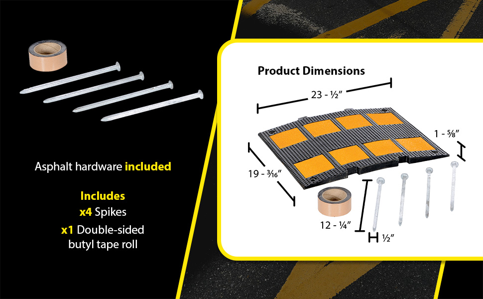 RSH-108-24-A RSH-108-24-ARubber Speed Hump Asphalt Hardware 110-3/4 In. x 23-1/2 In. x 1-5/8 In. 40000 Lb. Capacity Black / YellowUniform Capacity (lb.): 40,000