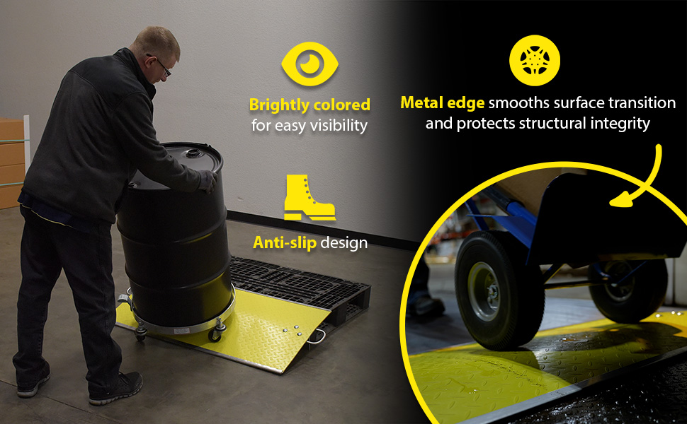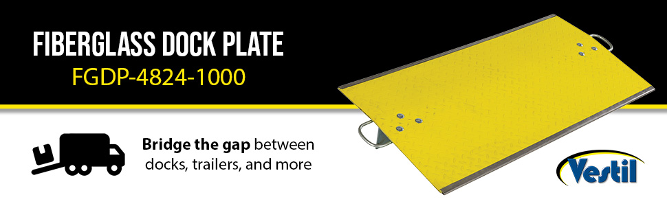 FGDP LightweightA Fiberglass Dockplate is a simple and manageable way to bridge the gap between areas. A lightweight construction enables simple maneuverability, while the brightly colored anti-slip design supports visibility when approaching entries and exits. A handle is included on either side for a more even lifting. A metal edge is attached to both sides of the dockplate to diminish the surface differences, as well as, protect the units overall structural integrity.