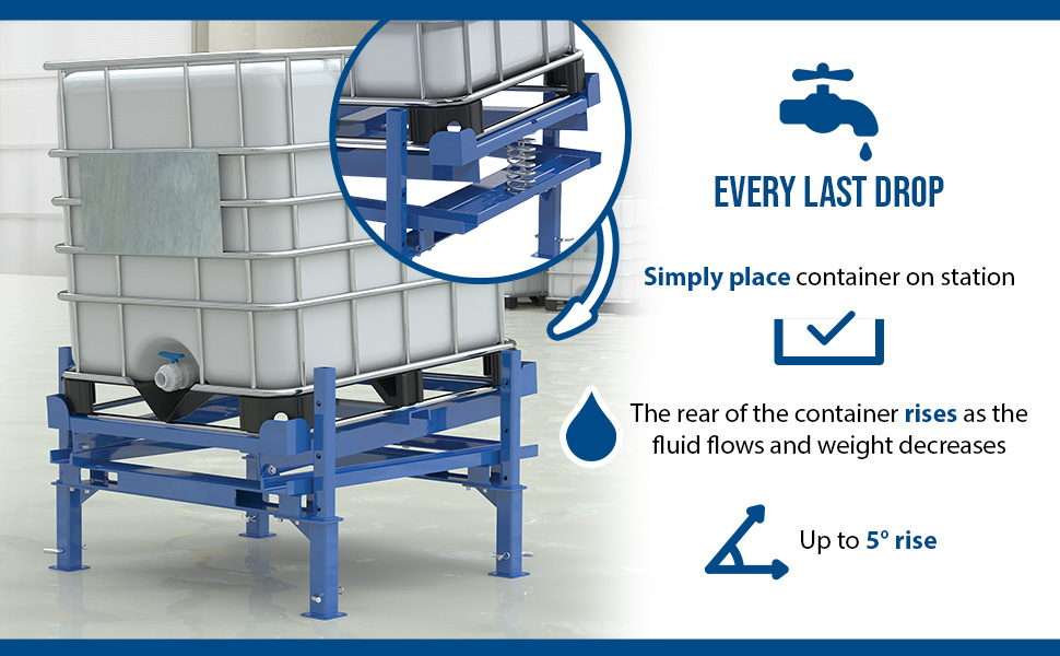 An Intermediate Bulk Container Tilt support stand is designed of a sturdy steel construction which, provides a secure tilting of containers for complete draining. The adjustable height of the stand allows for easy access to valve connections and minimizes user bending and twisting. To use, simply place the container on the stand. When the container is in the secure position, start the draining process. As the fluid flows from the container, the rear of the stand platform will rise up creating an angle for a better release of fluids. The stand has pre-drilled mounting holes for simple mounting to a variety of surfaces and fork pockets for simple movement, if necessary.