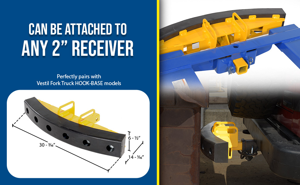 HOOK-BASE-38-RPB-2 HOOK-BASE-38-RPB-2Steel Fork Truck Hook Base 38 In. Length With Steel/Rubber Push Bumper-Attachment to 2 In. Receiver 15 In. x 28 In. x 5-3/4 In Blue/YellowUniform Capacity (lb.): 4000