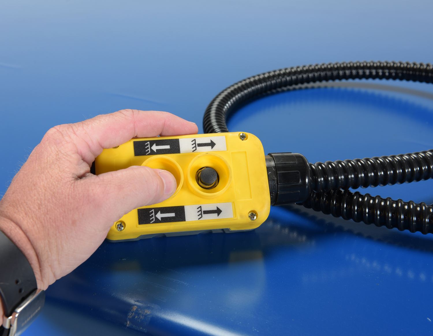 These lift tables operate using a factory air supply (minimum 80 CFM at 80 PSI) and feature a high-performance rotary air/oil power unit for reliable lifting up to heavy-duty capacities. Built-in safety elements include pneumatic upper travel limit switches, safety toe guards, and internal velocity fuses to maintain platform stability in the event of hose failure. Lifetime-lubricated sleeve bearings reduce maintenance while ensuring long service life. A two-button hand control on an extended hose allows safe and convenient operation.