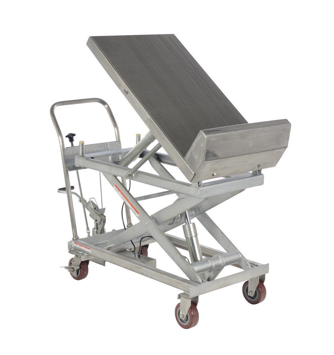 Models CART-400-LT and CART-600-LT are elevated by means of a foot actuated hydraulic cylinder. As the table is raised, it simultaneously tilts to an angle of 45 degrees at full elevation. Builtin retaining lip keeps containers in place. Units roll on 5" polyurethane casters, two (2) rigid and two (2) swivel with brakes.
