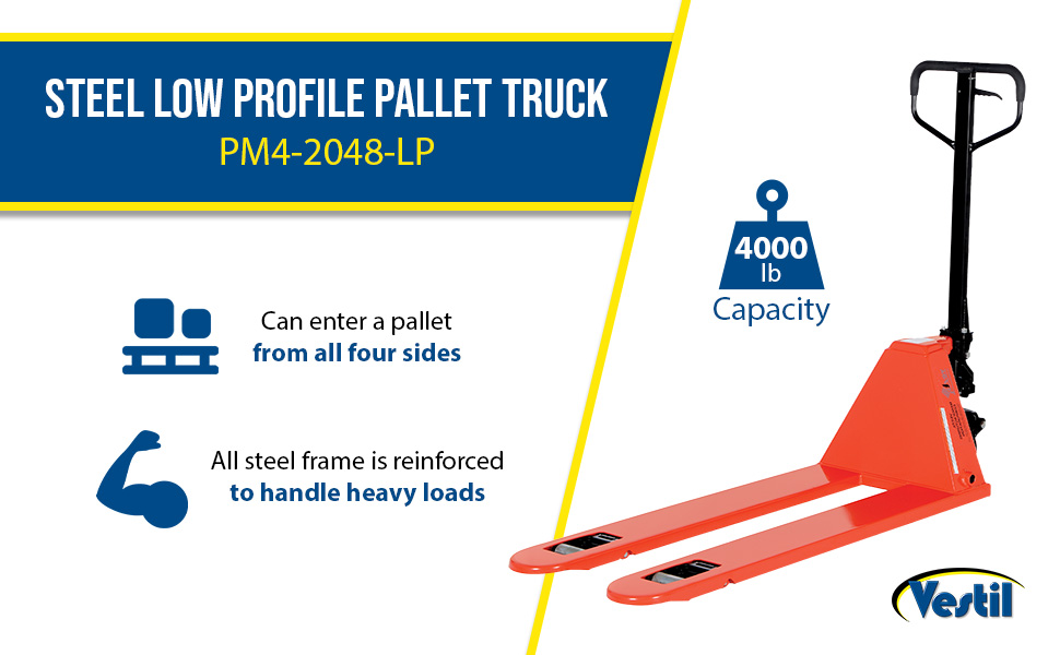 PM4-2048-LP PM4-2048-LPSteel Low Profile Pallet Truck 61 In. x 20-1/2 In. x 49 In. 4000 Lb. Capacity RedUniform Capacity (lb.): 4,000