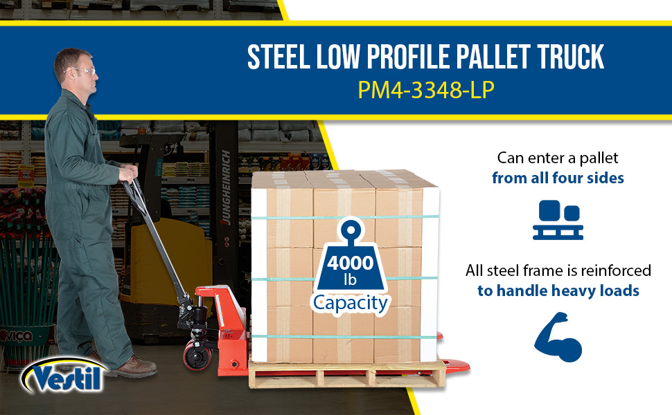 PM4-3348-LP PM4-3348-LPSteel Low Profile Pallet Truck 63 In. x 33 In. x 48 In. 4000 Lb. Capacity RedUniform Capacity (lb.): 4,000