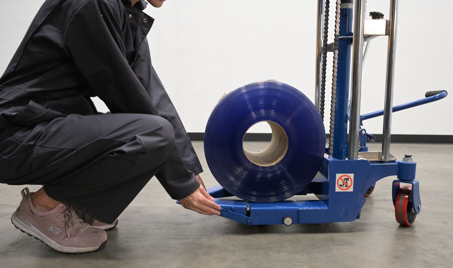 A compact roll lifter provides an efficient approach to loading and unloading large, heavy rolls. Simply designed, the cradle is lifted and lowered by use of the hydraulic foot pedal. For safe loading and unloading of rolls, ramps are attached to the front of the cradle to assist the user. The ramps can be placed upright to lock the product into position or can be unfolded to allow the release of the product. The narrow wheel base allows the lifter to be used in compact and crowded areas. Constructed of steel with a blue powder coat finish.