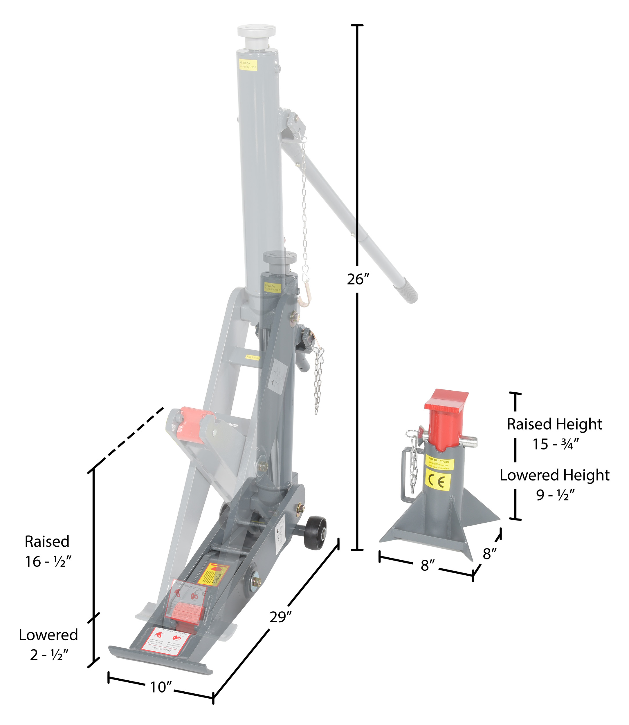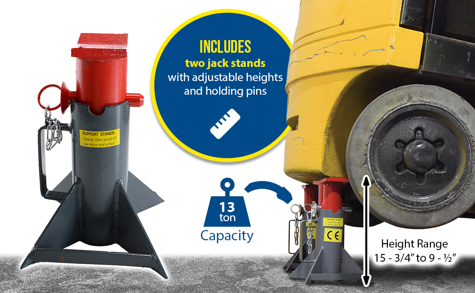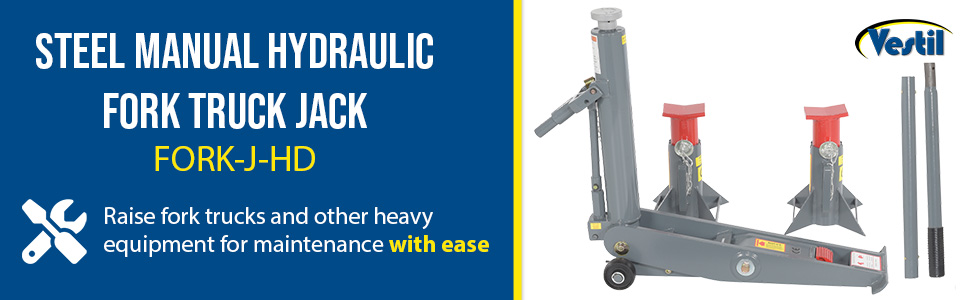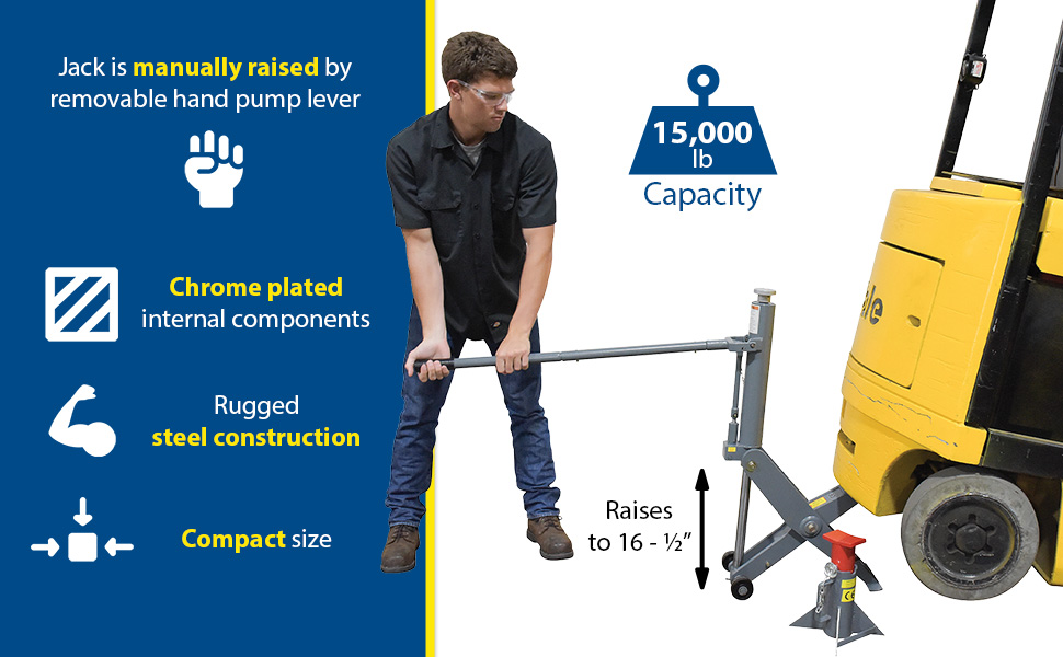 Manual Hydraulic Fork Truck Jack Designed to raise your fork truck for maintenance. Features high-quality seals, chrome plated internal components and rugged steel construction. Maximum lift of 16" provides room needed to perform a variety of repairs. Manually raised by hand pump lever. Removable handle and compact size makes it easy to maneuver and transport. Includes two jack stands (13 ton capacity per pair), with holding pins for adjustable heights.