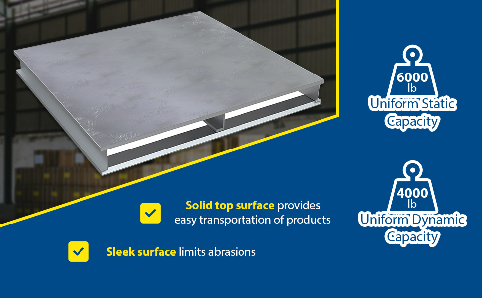 AP-ST-4824 AP-ST-4824Aluminum Heavy Duty Solid Top Half Pallet 24 In. x 48-1/8 In. x 6 In. 4000 Lb. Capacity SilverUniform Capacity (lb.): 4,000