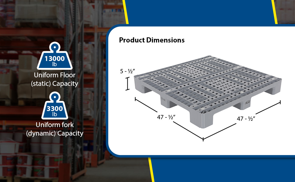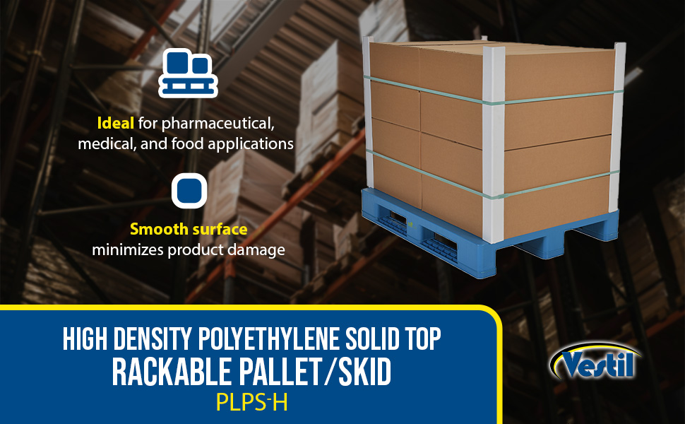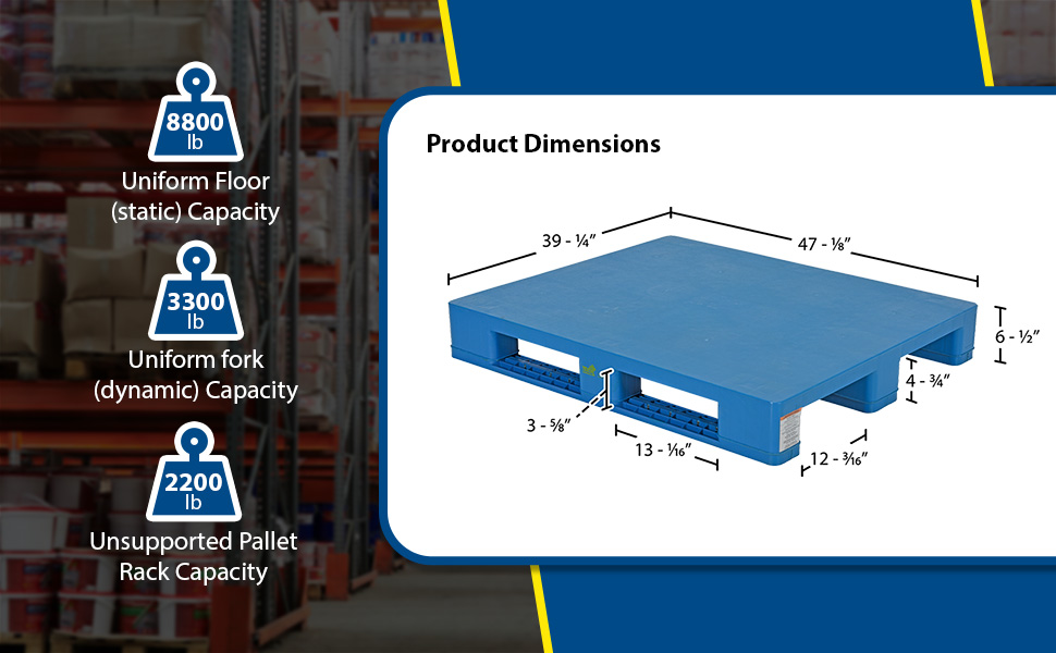 PLPS-H PLPS-HHigh Density Polyethylene Solid Top Rackable Pallet/Skid 39-1/4 In. x 47-1/8 In. x 6-1/2 In. 8,800 Lb. Floor Capacity BlueOverall Width (in.): 39-1/4