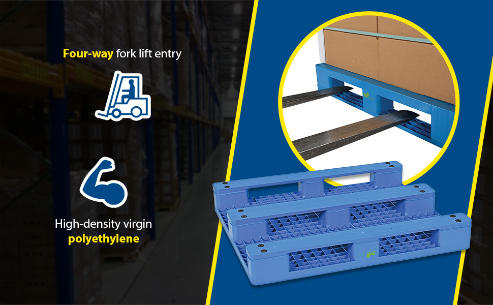 This innovative design unites two essential product features; capacity and versatility. Pallet/ Skid provides 4-way entry, 2-way by pallet truck and 4-way by a fork truck. The fork opening is 11-3/4"W x 3-1/4"H. The skid opening is 10-1/2"W x 3-3/4"H. Features anti-slide grommets which prevent the pallets from sliding off the forks and each other during transit.