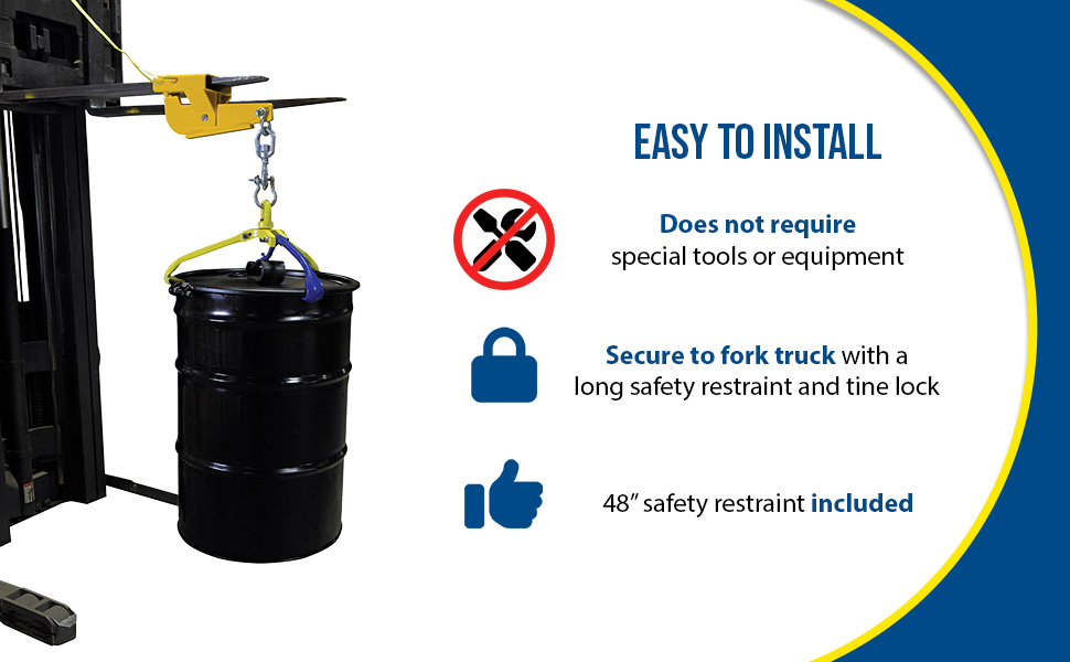 Convert your fork truck into a hook with anchor in a matter of seconds. The easy to attach Hoisting Hook does not require the assistance of special tools. Secured to the fork truck by means of a 48" long safety restraint and screw clamps. Available in single or double fork design. Units are zinc plated. Hook with shackle included. Model S-FORK-4-AT, Auto-Tension Hoisting Hook, offers a unique design and adds tension as weight is added, this unit has a yellow baked-in powder-coated toughness.