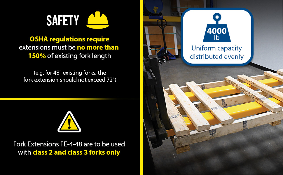 FE-4-72-BK FE-4-72-BKSteel Fork Extensions 4 In. x 72 In. 4000 Lb. Capacity BlackUniform Capacity Per Pair (lb.): 4,000