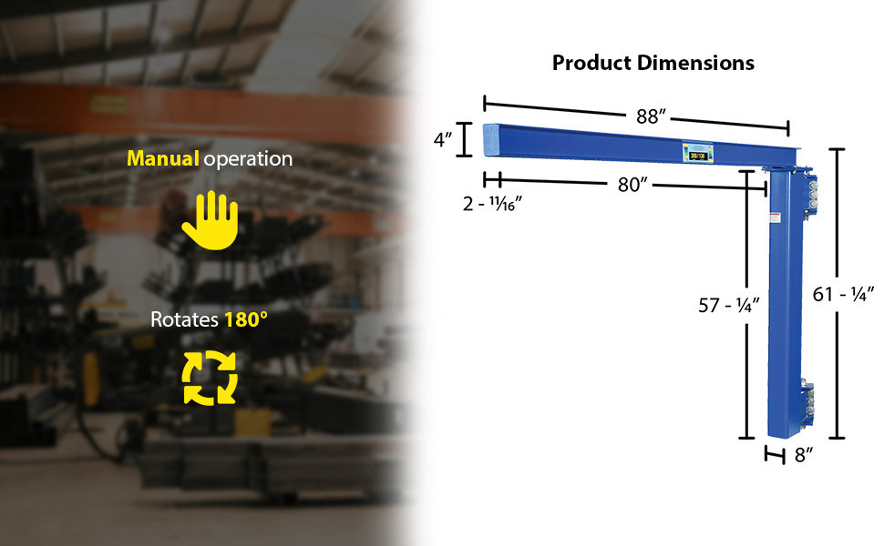 Designed to assist workers in the maneuvering of materials as well as achieving maximum headroom where low ceilings are of concern. This cantilever style mounts to true vertical wall members. Increase personnel productivity by lifting awkward materials. The overall I-beam length is 88" with a usable length of 80". Overall length of jib is 96-1/8". Unit rotates 180 degrees. Steel construction with painted blue finish. Hoists & Trollies can be ordered seperately.
