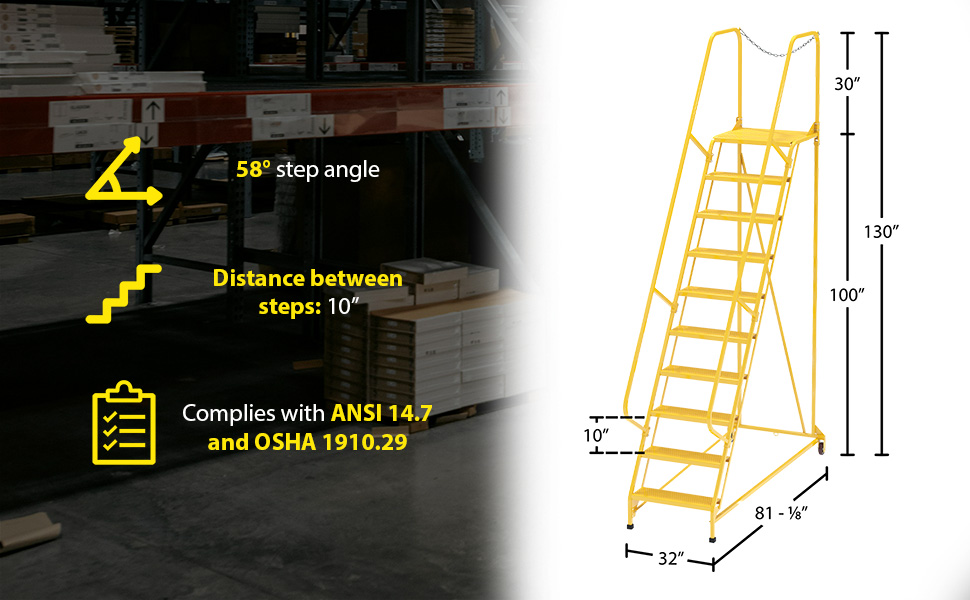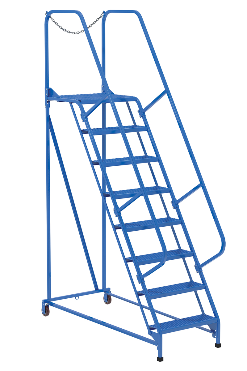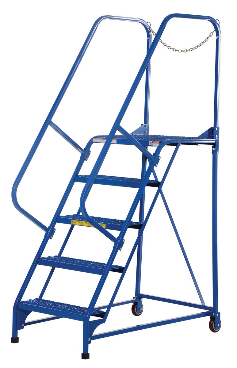 Portable ladders for use around warehouses, hardware stores or inventory rooms. Tilt the unit to allow for portability. Units roll on 4" poly-on-poly wheels. Constructed of square tubing framework which handles uniform capacities up to 350 lbs. Features 30" high removable hand railing, (36" on 12 step models), access chain, 21" deep top platform, and an industrial baked-in blue powder coat finish for toughness. Each step measures 24" wide by 7" deep and is spaced 10" apart. Model with 5-12 steps are ship crated, some assembly required. Complies with ANSI 14.7 and OSHA 1910.29 specifications.