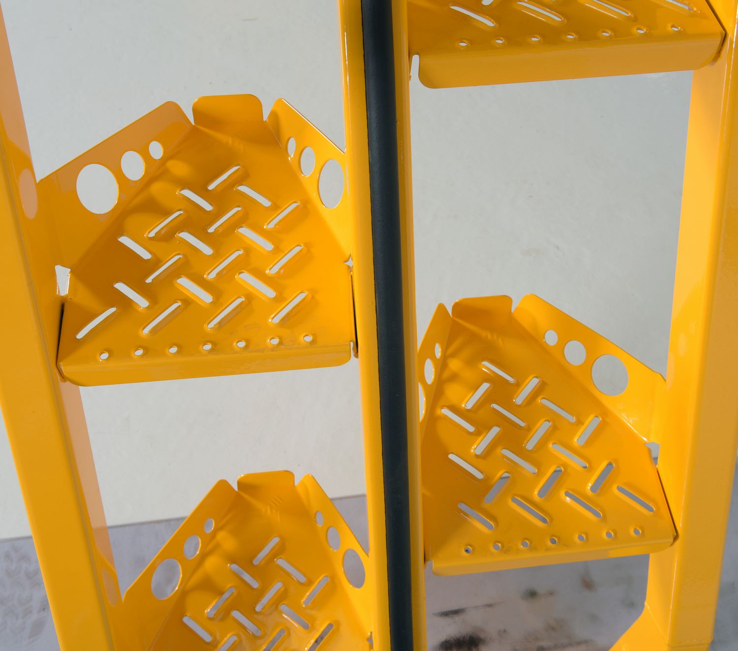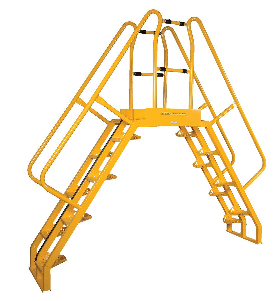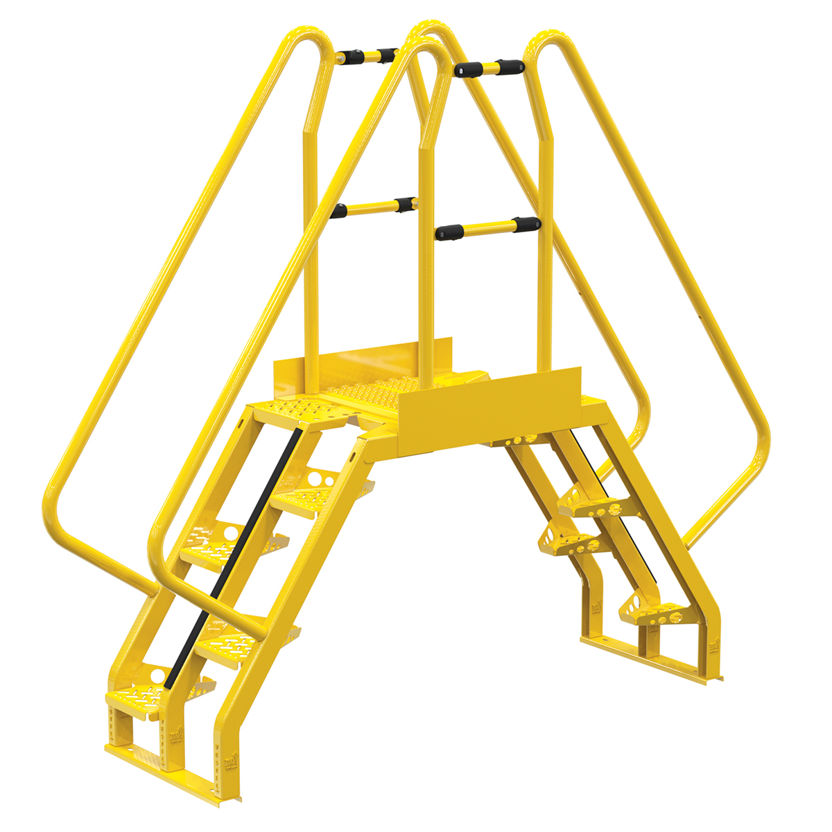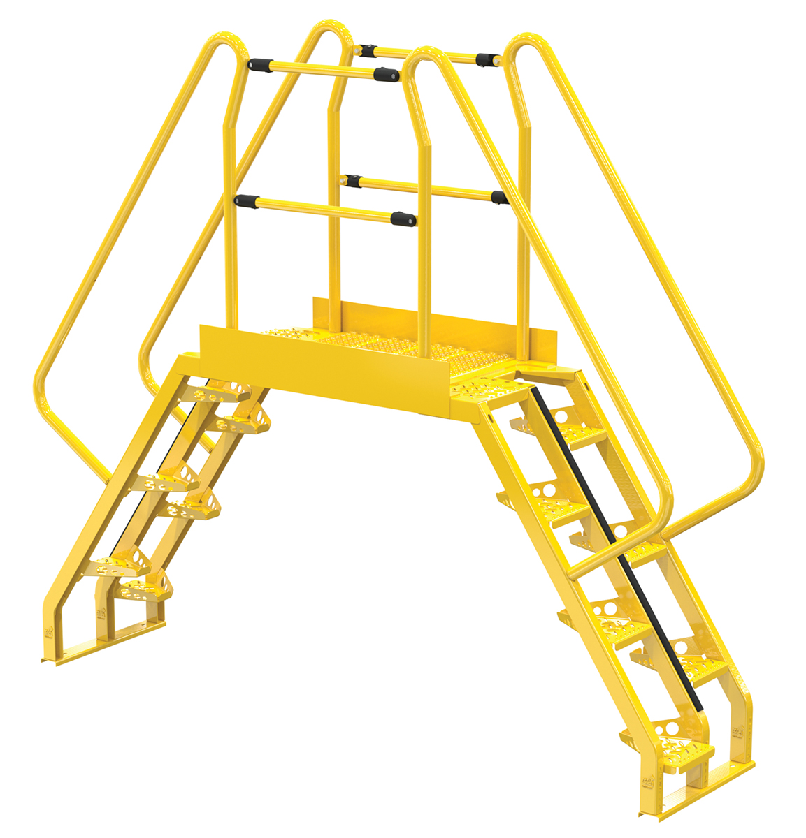 COLA-4-56-20 StepsMount where you need permanent access at crossover points. Alternating step design for shorter overall span than other units. The upper platform features removable two sided 39" high handrail with 21" mid-rail and fixed 4" toeboards to prevent objects from rolling off. Usable width is 20-1/16" between handrails. Heavy-duty uniform capacity rating of 350 pounds per unit. Includes lag-down points for securing to floor, mounting hardware not included. Steel construction with baked-in powder-coated finish for added toughness. Meets OSHA rule1910.25(f) et seq.