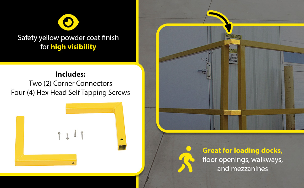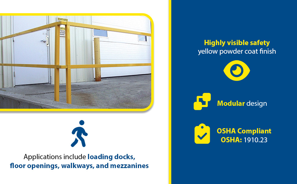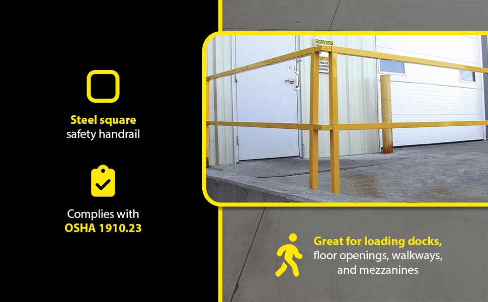 Steel Square Safety Handrails are an economical way to protect people and machinery. Applications include loading docks, floor openings, walkways, and mezzanines. Highly visible safety yellow powder coat finish. Available with or without toeboards as application requires.