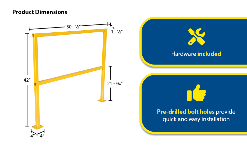 SQ-48-HWR SQ-48-HWRSteel Safety Handrail with Hardware 50-1/2 In. x 4 In. x 42 In. YellowSquare Tube O.D.(in.): 1-1/2