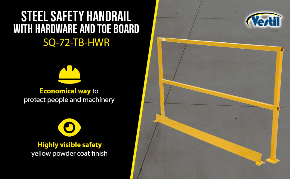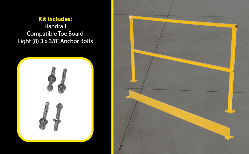 SQ-48-TB-HWR SQ-48-TB-HWRSteel Safety Handrail with Hardware and Toe Board 50-1/2 In. x 4 In. x 42 In. YellowSquare Tube O.D.(in.): 1-1/2