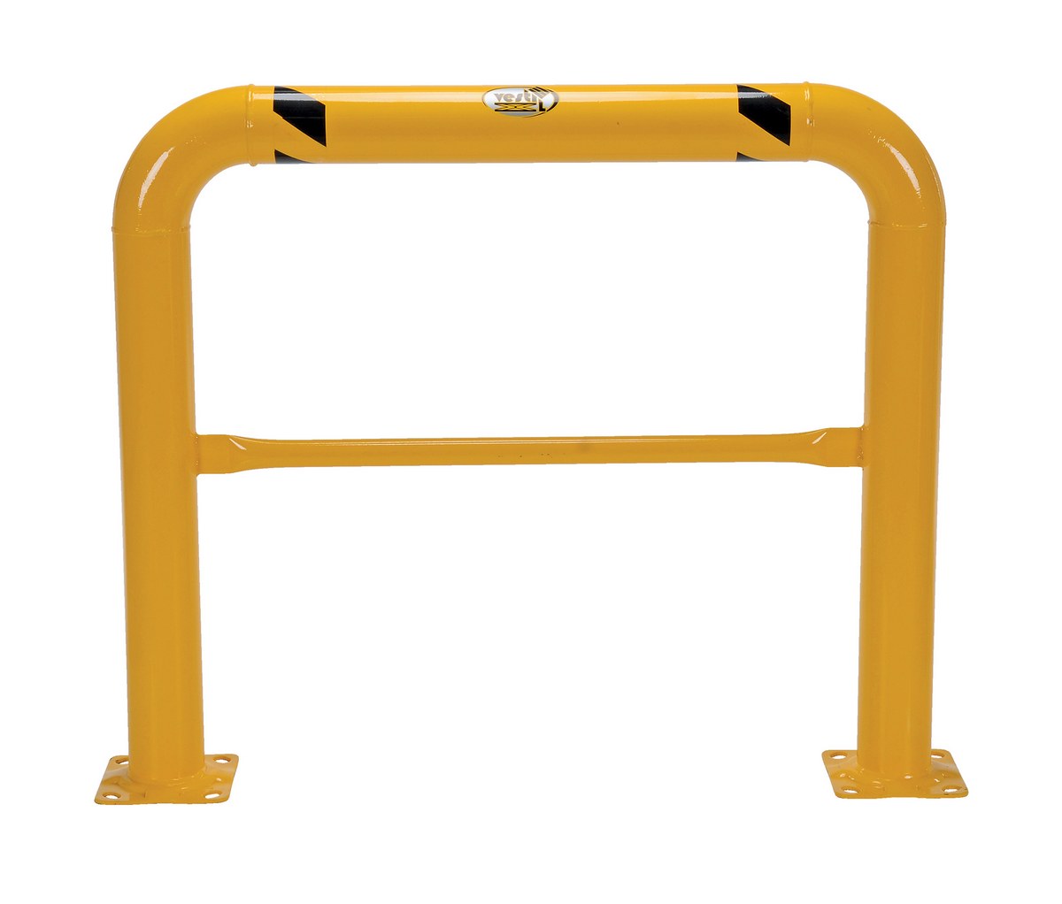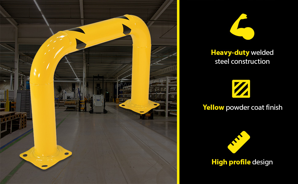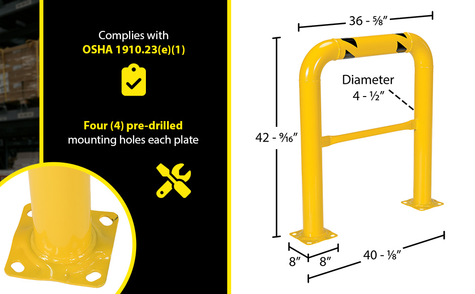 Heavy-duty welded steel construction for protecting racks, building walls, expensive equipment, and hundreds of other applications. All 42" high units include a 21" mid-rail to comply with OSHA requirements. Available with a baked-in yellow powder coated finish for toughness. A 304 stainless steel polished finish is also available. Two base plates with four pre-drilled mounting holes in each plate.